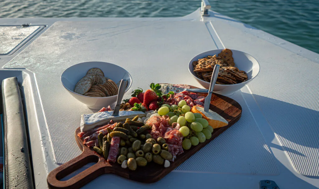 This trip includes snorkeling gear, Strea punch, alcoholic beverages, refreshments, a charcuterie board, and snacks.